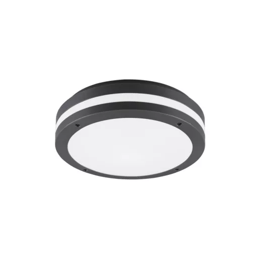 Antracit színű műanyag vázas kültéri mennyezeti lámpa fehér színű műanyag búrával, meleg fehér színhőmérsékletű beépített LED fényforrással, IP54-es védelemmel.