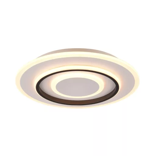 Fehér színű fém vázas kerek mennyezeti lámpa fehér-fekete színű műanyag búrával, 2700-6000K között változtatható színhőmérsékletű beépített LED fényforrással. A lámpa egyéb jellemző(i): távirányítóval, fényerőszabályzós, színhőmérséklet szabályzóval, éjszakai fény funkcióval.