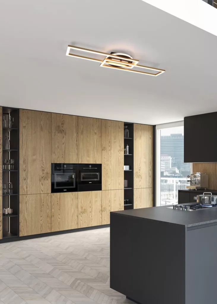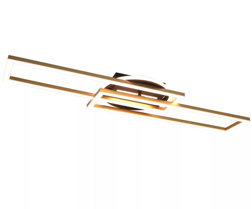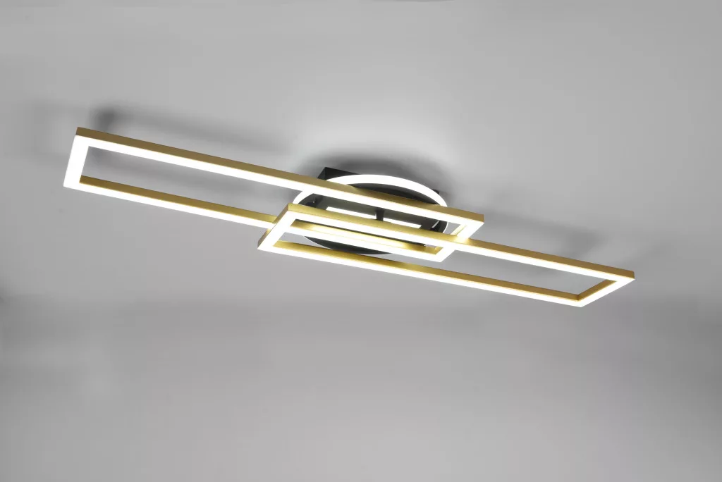 Fekete színű fém vázas mennyezeti lámpa sárgaréz-fehér színű fém és műanyag búrával, 2700-6000K között változtatható színhőmérsékletű beépített LED fényforrással. A lámpa egyéb jellemző(i): távirányítóval, fényerőszabályzós, színhőmérséklet szabályzóval, állítható fejű lámpa.