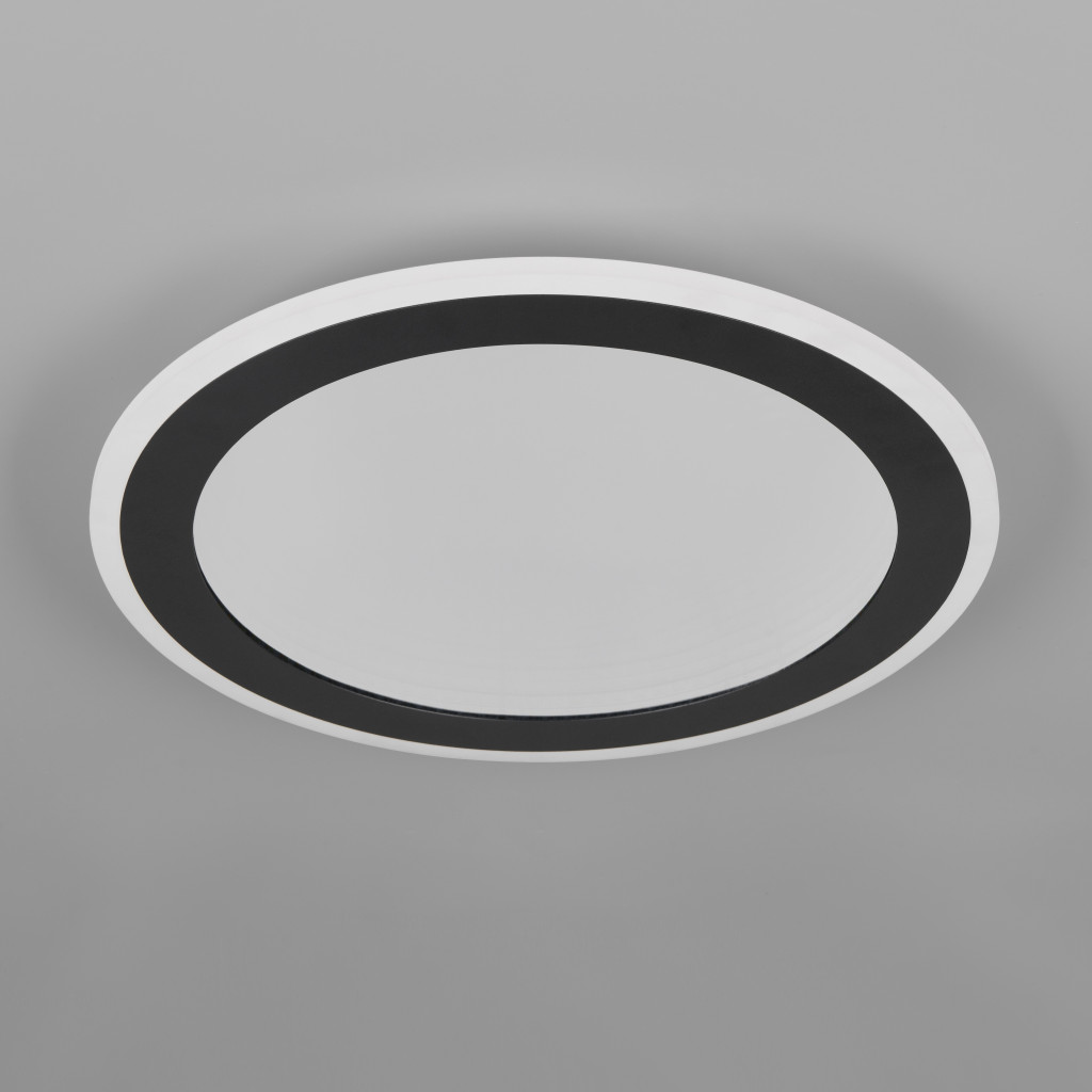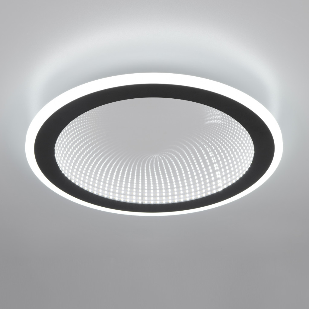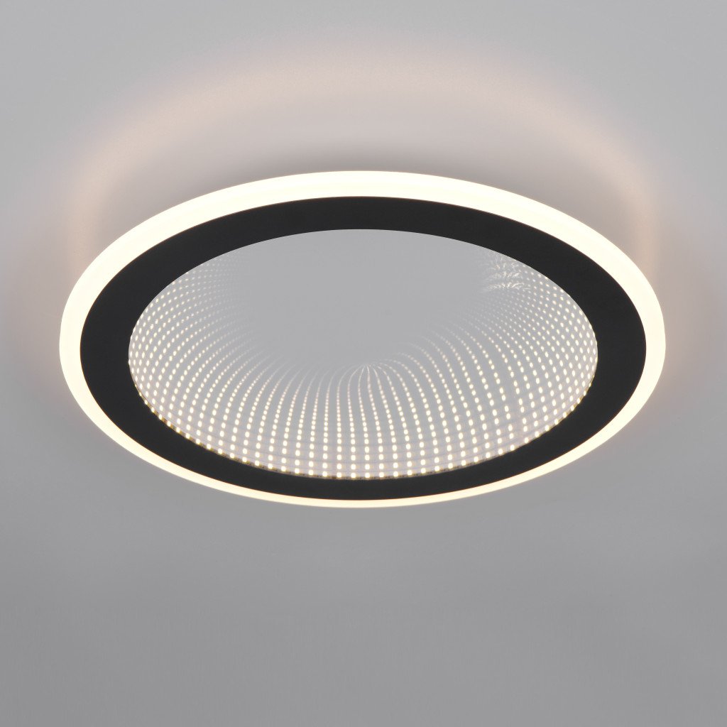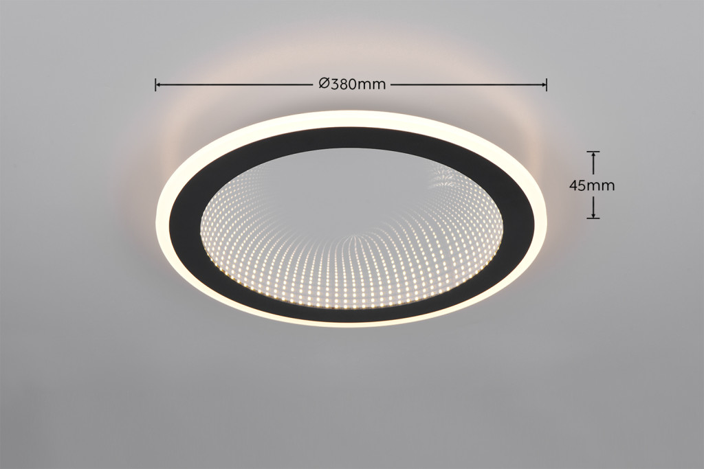 Matt fekete színű fém mennyezeti lámpa fehér műanyag betéttel, középen optikai ellúzióval, beépített LED fényforrással. A lámpához távirányító tartozik, mely segítségével állítható a LED fényereje, színhőmérséklete(2700-6500K), valamint időzítő és éjszakai fény funkcióval is rendelkezik.