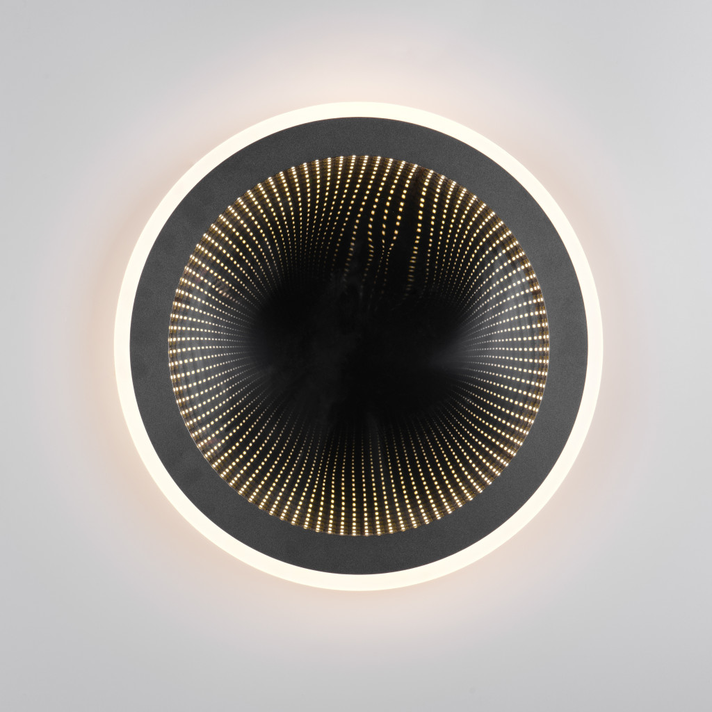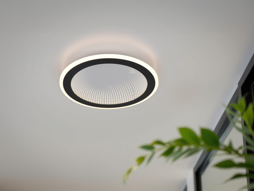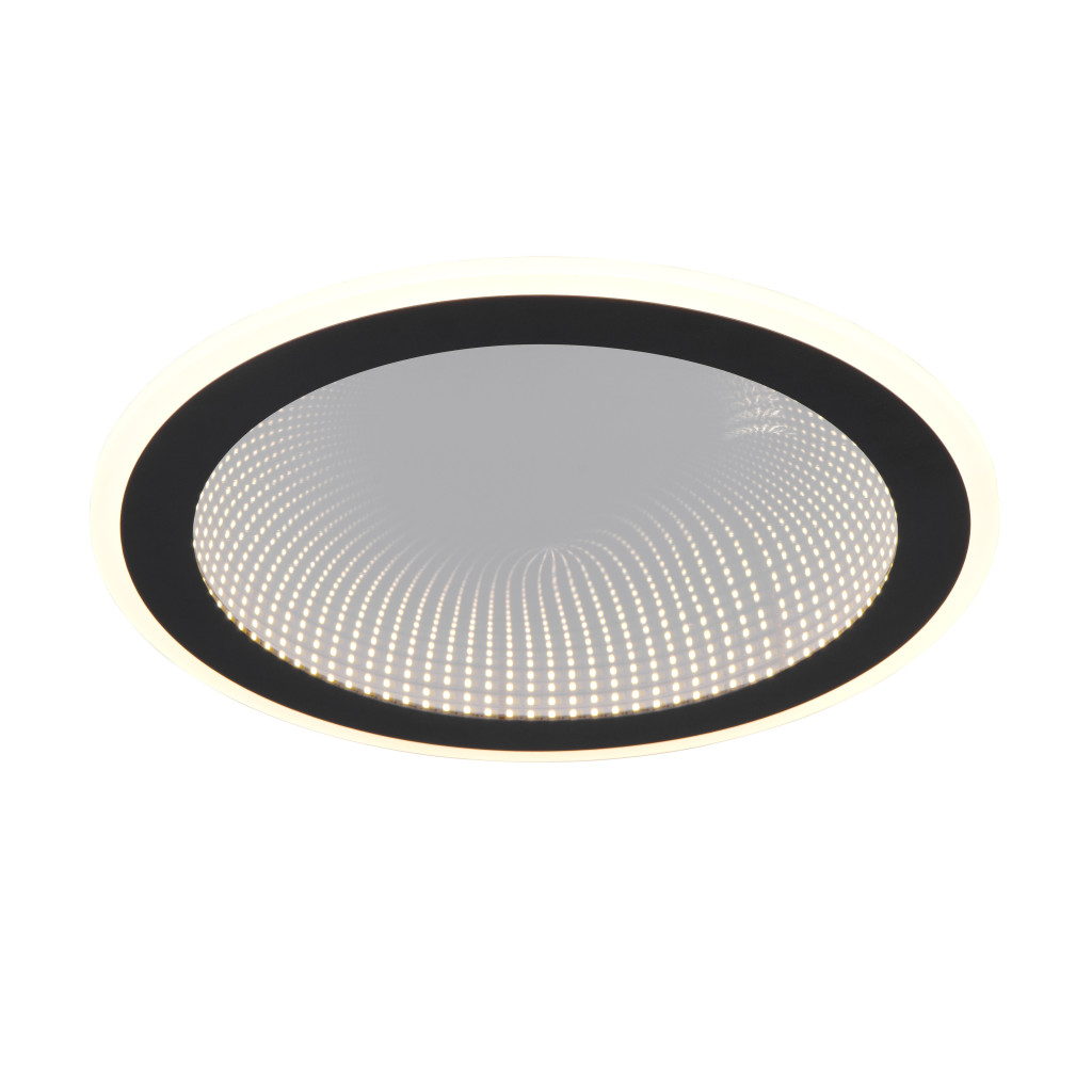 Matt fekete színű fém mennyezeti lámpa fehér műanyag betéttel, középen optikai ellúzióval, beépített LED fényforrással. A lámpához távirányító tartozik, mely segítségével állítható a LED fényereje, színhőmérséklete(2700-6500K), valamint időzítő és éjszakai fény funkcióval is rendelkezik.