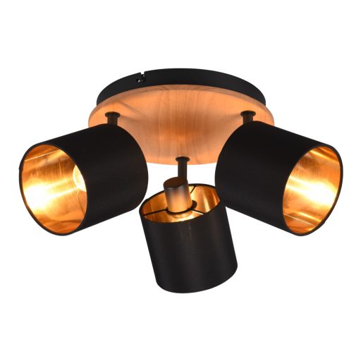 Fekete-barna színű fém és fa vázas mennyezeti spot lámpa fekete-arany színű textil búrával, E14-es foglalattal. A lámpa egyéb jellemző(i): állítható fejű lámpa.