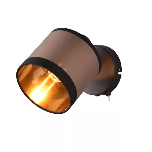 Fekete színű fém vázas fali spot lámpa tópszín színű textil búrával, E14-es foglalattal. A lámpa egyéb jellemző(i): állítható fejű lámpa, kapcsoló a lámpatesten.