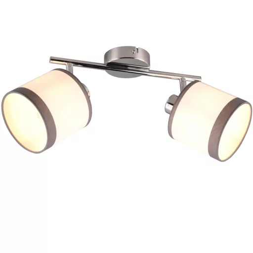 Króm színű fém vázas fali/mennyezeti spot lámpa fehér-szürke színű textil búrával, E14-es foglalattal. A lámpa egyéb jellemző(i): állítható fejű lámpa.