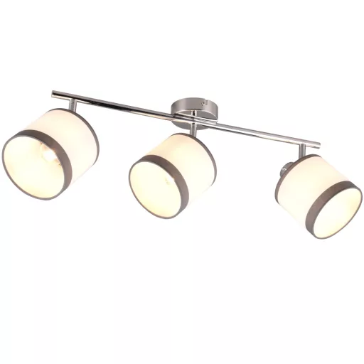Króm színű fém vázas mennyezeti spot lámpa fehér-szürke színű textil búrával, E14-es foglalattal. A lámpa egyéb jellemző(i): állítható fejű lámpa.