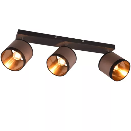 Fekete színű fém vázas mennyezeti spot lámpa tópszín színű textil búrával, E14-es foglalattal. A lámpa egyéb jellemző(i): állítható fejű lámpa.